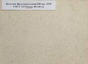 Ткань «Фильтробельтинг» БФ-БД арт. 2030 – хлопчатобумажная техническая ткань, 100% х/б, изготовлена по ГОСТ 332-91. Поверхностная плотность – 950 г/м2. Ткань Фильтробельтинг используется в различных отраслях промышленности (пищевой, химической, фармацевтической, цветной металлургии и других). Благодаря своей структуре и переплетению нитей, ткань гладкая и одинаково плотная как с лицевой, так и изнаночной стороны и имеет только прямолинейные поры, способствующие качественной фильтрации.